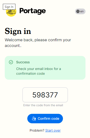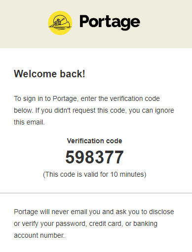 A secure code will arrive in your inbox shortly from "accounts@portage.so". If it doesn't make sure to check your Spam folder.